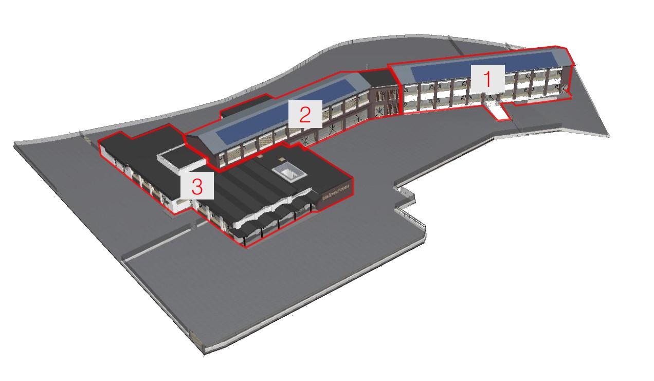 L'école élémentaire Georges Pompidou de Riom-ès-Montagnes est constituée de 2 corps de bâtiments reliés par des circulations intérieures horizontales et verticales :